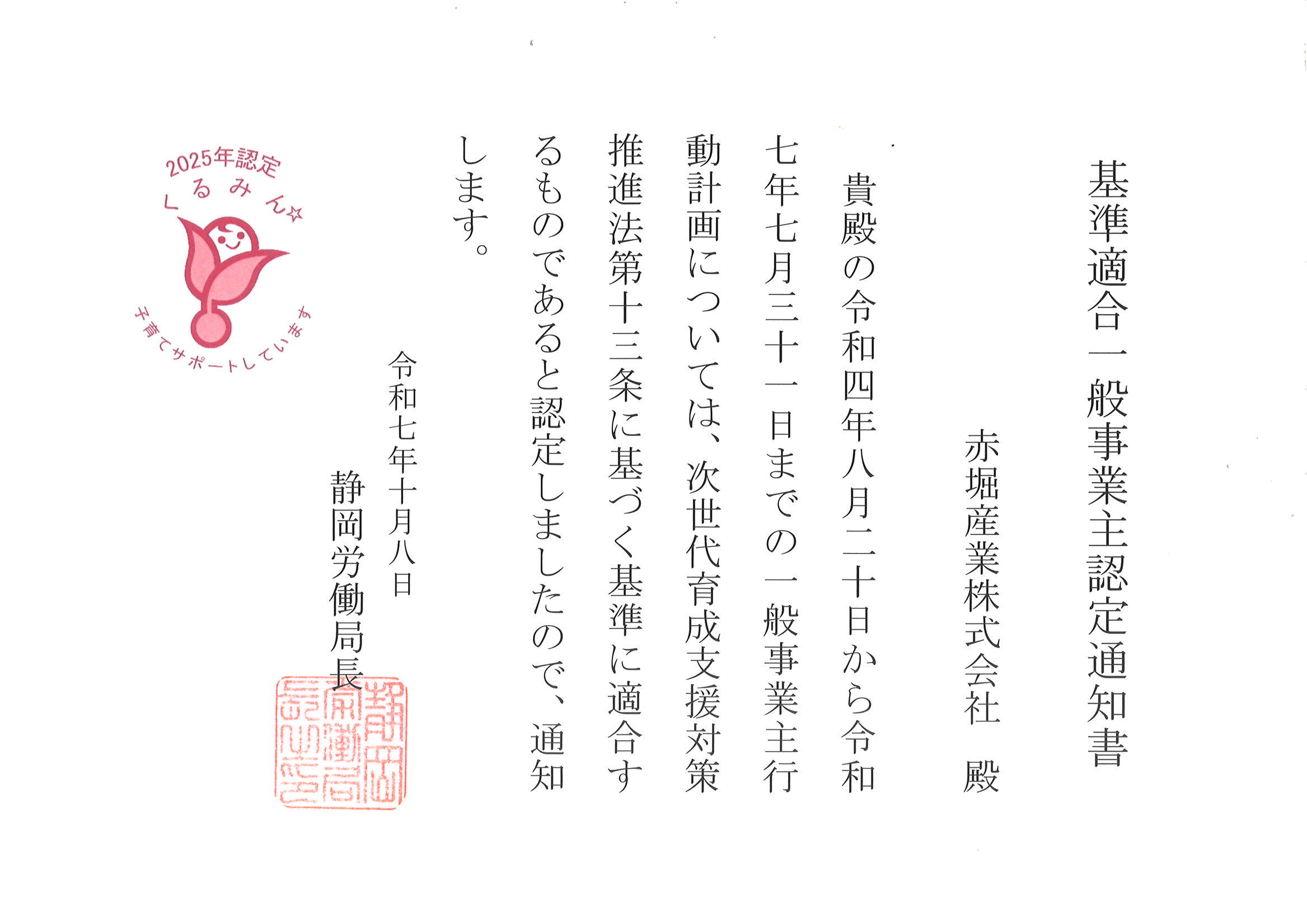 この度弊社は、厚生労働省より「子育てサポート企業」として『くるみん認定』を受けました。